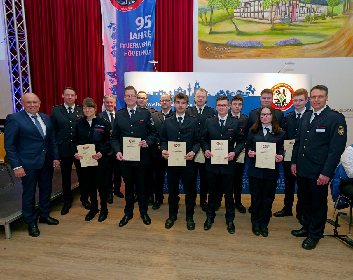 Das Ehrenzeichen in Gold für 35-jährige Treue erhielt René Hentschel, und Helmut Schiermeyer wurde mit der Sonderauszeichnung in Gold des Verbandes der Feuerwehr (VdF) für fünf Jahrzehnte in der Feuerwehr geehrt. Alle Geehrten spendeten gemeinsam 300 Euro für die Arbeit der Jugendfeuerwehr.Befördert wurden zur Feuerwehrfrau/zum Feuerwehrmann: Emma Hentschel, Marlon Voß, Benjamin Walkenbach und Johannes Hils; zum Oberfeuerwehrmann: Florian Wiethoff und Tarik Colak; zum Hauptfeuerwehrmann: Patrick Desel; zum Unterbrandmeister: Daniel Wördemann; zum Oberbrandmeister: André Kipshagen, zum Hauptbrandmeister: Kevin Wiethoff und zum Gemeindebrandinspektor: Dietmar Röring.